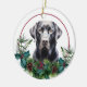 À l'avant de cet ornement de vacances se trouve un beau portrait d'un chien de Labrador Retriever noir encadré par une chèvre sainte et à feuillage persistant. Les baies rouges et les cônes de pin ornent les sprigs de houx et de pin. L'image est placée sur un cercle blanc à l'intérieur d'un cercle mince de ligne rouge. L'arrière de l'ornement a la même couronne à feuillage persistant et rond avec votre texte personnalisé en rouge. Parfait pour tous ceux qui sont "possédés" par un black Lab.