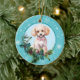 A l'avant de cette fête est un beau portrait d'un chien de caniche blanc encadré dans un bocal saint et à feuillage persistant. Les baies rouges et les cônes de pin ornent les sprigs de houx et de pin. L'image est placée sur un cercle bleu pâle encadré par un motif de flocon bleu rétro. Le dos de l'ornement a le même arrière - plan et cercle avec votre texte personnalisé en bleu.