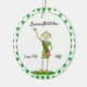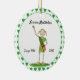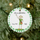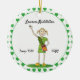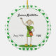 Nom personnalisable, numéro de troupe et année pour ce mignon, blonde, juniors en queue de cheval portant un uniforme vert et une ceinture, boîte à biscuits rouges, debout dans l'herbe agitant. Un motif en forme de coeur vert borde l'ornement.