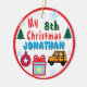 Boy 8th Christmas or any age. Merry Christmas in fun snowcapped red typography. Child's Name in blue. 8th written in green (insert Any Age 1st, 2nd, THIRD, etc.). Cute whimsical orange toy car, gift box, red ornament and green trees. Peace on Earth and Year (insert YEAR) written on backside of two-sided items. Designs by TamiraZDesigns.