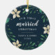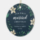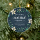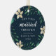 Célébrez votre premier Noël en couple marié avec cet ornement charmant et festif. Le design présente "Noël du premier marié" et l'année en lettres blanches, entourée de fleurs de poinsettia en ivoire et de feuillage vert de vacances sur un riche arrière - plan bleu marine. Ajoutez une photo à l'arrière avec des ornements botaniques de vacances assortis.