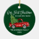 Script moderne de brosse Notre premier Noël dans notre nouvel ornement de maison comprend Watercolor Vintage Camion rouge avec arbre de Noël. Arrière - plan vert forestier.