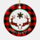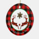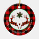 Deux cerfs bondés en plaid sont séparés par un petit coeur. Au-dessus, on trouve un flocon de neige plaid de buffle vert et rouge. L'image est placée sur un arrière - plan blanc et encadrée en vert de Noël. Le texte de la coutume en blanc en bas dit "Joyeuses fêtes du (nom)" sur une bordure de cercle rouge et noir de buffle plaid. L'arrière a la même image et la même bordure avec un autre champ de texte que vous pouvez customiser.