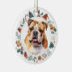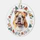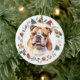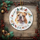 Ce joli ornement de vacances présente une aquarelle d'un beau Bulldog brun et blanc. L'image est encadrée dans une couronne de cercle colorée constituée de diverses images de vacances, dont un bonhomme de neige, des cloches, du sucre de canne, du stockage, du saint, et plus ! L'arrière de l'ornement a la même image de couronne avec votre texte personnalisé en vert, or et rouge.