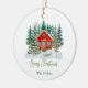 Beau ornement de Noël. Ce qui souligne une belle forêt d'arbres enneigés et un joli cabine rouge au centre. Au bas de l'ornement il dit Joyeux Noël et en dessous il y a un espace réservé pour personnaliser le nom de famille et la date. Il peut être avec une belle police, comme si c'était un cadeau spécial pour cette famille particulière. En outre, vous pouvez le customiser très facilement en modifiant simplement le modèle avec le nom et l'année que vous voulez.