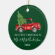 Calligraphie Moderne Tendance Écriture Notre Premier Noël en tant que M. et Mme. Ornement comprend un Camion Rouge Aquarelle Vintage avec un Arbre de Noël - Vert Forêt