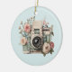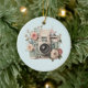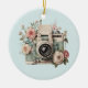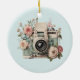 Ornament with a vintage styled camera decorated with flowers. Pastel colors of pink, cream and green.