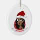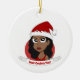 ornement de Noël avec une illustration de la belle jeune femme afro-américaine aux cheveux ondulés et le casquette du Père Noël ; avec modèle texte modifiable, design de vacances de Noël avec un arrière - plan rouge