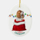 Sur le devant de cet ornement de Noël est l'image d'un adorable Roi Cavalier blanc et marron Charles Spaniel dans un sac cadeau de Noël rouge et blanc. Derrière le chien se trouve une série de lumières colorées de Noël. Le texte en bas dit "Joyeux Noël". Le dos de l'ornement a la même image avec un champ de nom personnalisé.