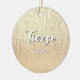 Un nom moderne et audacieux et une date en blanc avec une ombre noire sur un ornement en céramique ronde. La taille, la couleur et le style de la police sont personnalisables. L'arrière - plan est une fausse texture d'art numérique doré au champagne qui imprime comme une photo. Ajoutez la photo de famille de votre fille.