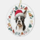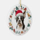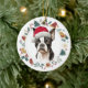 Voici un ornement personnalisé mignon pour quiconque aime un peu le chien Boston Terrier. Le devant comporte un Boston aquarelle portant un chapeau de Père Noël. L'image est encadrée dans une couronne circulaire colorée composée de diverses images de vacances, y compris un bonhomme de neige, des cloches, un bâton de bonbon, une chaussette, du houx, et plus encore ! Le dos de l'ornement comporte la même image de couronne avec votre texte personnalisé en vert et rouge.