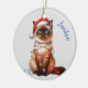 A l'avant de cet ornement de Noël se trouve l'image d'un chat balinais portant un chapeau de Père Noël rouge et blanc, qui s'est enveloppé dans une série de lumières de Noël. Le nom de votre enfant est en bleu à droite de l'image. Le texte à l'arrière dit "Cher PÈRE NOËL, Définissez NAUGHTY". Il y a des champs de texte supplémentaires en rouge et bleu pour vous permettre de customiser votre salutation et votre signature. Mignonne, surtout pour un enfant "possédé" par un chat espiègle. Il est facile de customiser que c'est de maman et papa, ou de grand-mère et grand-père aussi.