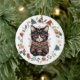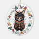 Ce joli ornement de vacances présente une aquarelle d'un adorable chat noir style boho habillé d'un pull d'hiver turquoise et rouille. L'image est encadrée dans une couronne de cercle colorée constituée de diverses images de vacances, dont un bonhomme de neige, des cloches, du sucre de canne, du stockage, du saint, et plus ! L'arrière de l'ornement a la même image de couronne avec votre texte personnalisé en vert, or et rouge. Voir d'autres designs chez Dog Village, y compris de nombreux produits pour chiens de races et chats.