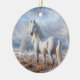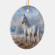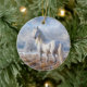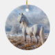 Un majestueux cheval blanc se dresse gracieusement dans un pâturage enneigé sous un ciel bleu clair et nuageux. Un ornement de Noël charmant, qui respire la beauté et la force.