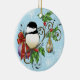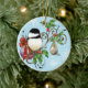 Joli poulet entouré de flocons de neige assis sur une branche sainte avec des ornements de Noël.