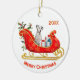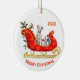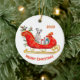 Un mignon chien dalmate est assis parmi des paquets cadeaux emballés dans un traîneau de Noël rouge et or orné. En haut se trouve un champ de texte qui peut être customisé pour votre nom ou l'année en cours. En bas se trouve un autre champ de texte personnalisé qui dit "Joyeux Noël". Les deux côtés de l'ornement ont la même image.