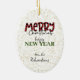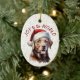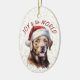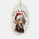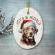 Sur le devant de cet ornement de vacances est une belle image d'un chien de Labrador Retriever brun chocolat dans un casquette du Père Noël. Derrière l'image se trouve un arrière - plan à confettis doré. Le texte rouge dit "Joy to the World". Le dos de l'ornement a le même arrière - plan confetti et des champs de texte pour vous de personnaliser chaque ornement.