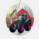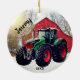 Le tracteur vert préféré d'un fermier est garé devant une vieille grange rouge dans la neige.