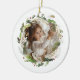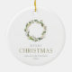 This elegant Christmas ceramic ornament features a delicate watercolor wreath of greenery, soft foliage, and subtle red berries encircling a customizable photo, adding a personal touch to your holiday decor. The "Merry Christmas" greeting is printed in an elegant serif font, with options to add a family name and year, making it a cherished keepsake or thoughtful gift for loved ones. Perfect for decorating the tree or adding a festive touch to your home, this ornament brings warmth, style, and holiday cheer to your seasonal decorations.