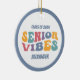 Un cadeau de rétro amusant pour la personne âgée diplômée. Ce ornement de Noël présente un texte de style années 1970 qui dit "vibes seniors". Personnalisez avec le nom de la grade.
