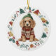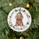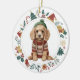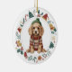 Ce joli ornement de vacances présente une aquarelle d'un adorable chiot Cocker Spaniel habillé dans son pull et son casquette d'hiver. L'image est encadrée dans une couronne de cercle colorée constituée de diverses images de vacances, dont un bonhomme de neige, des cloches, du sucre de canne, du stockage, du saint, et plus ! L'arrière de l'ornement a la même image de couronne avec votre texte personnalisé en vert, or et rouge.