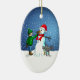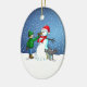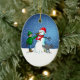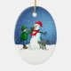 Le garçon a construit un bonhomme de neige que son chien tient debout et urine pendant que le garçon donne à l'homme de neige un nez de carotte.