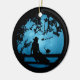 Une cowgirl et son chat regardent les rennes de Père Noël et traîneau passer dans une belle et grande lune bleue. Un pays amusant de l'Ouest de Noël décoration de décoration de fête de Noël.