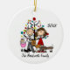Un joli ornement de Noël en céramique ronde avec un couple en bâton, une petite fille en carrosserie rose, et trois chiens devant un sapin décoré avec des zones que vous pouvez customiser avec votre nom de famille et l'année en cours! Ce joli ornement de gardien de vacances fait un grand cadeau pour la jeune famille de commémorer une année spéciale!