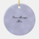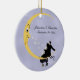 Cet ornement rond en céramique suspendu est composé d'un couple romantique habillé en noir assis sur une lune jaune croissant en colère avec des étoiles blanches éparpillées derrière eux sur un arrière - plan bleu clair. Customisez vos noms et dates sur le devant et votre message sur le dos avec les modèles.