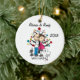 Un ornement en céramique mignon, d'amusement comportant un chiffre couple dans l'expectative de bâton, un chien blanc de taille moyenne, le chat gris, l'arbre de vacances, et le texte qui nous lit "prévoient !" avec un secteur vous pouvez ajouter vos noms ou nom de famille et l'ajouter l'année en cours !