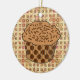 Ornement d'un Cupcake avec glaçage caramel garni de saupoudrées de chocolat, dans un décor, brun chocolat et bronze, emballage de pois de cupcake, sur un arrière - plan à motif batik marron clair et beige