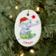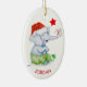 Ce joli ornement pour enfants de Noël est orné d'un adorable éléphant gris aquarelle qui porte des fonds de pyjama rayés verts et rouges et un chapeau de Père Noël rouge. Il offre un cadeau attaché avec un ruban rouge. Une étoile rouge brille au-dessus de lui, et une ampoule verte et blanche est à son genou. Le nom de votre enfant est en rouge en bas. Le verso comporte quatre champs de texte en rouge et en vert pour vous permettre de customiser. C'est mignon pour un grand-parent de donner à un petit-enfant, ou un parent de donner à une fille ou un fils.