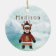 L'illustration de l'aquarelle présente des rennes mignons en tenue hivernale complète, y compris un pull, un casquette, des gants et des bottes avec arrière - plan de scène hivernale. Personnalisez avec du texte personnalisable en police marron moderne