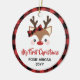 Première décoration de Noël du bébé avec un renne mignon avec un gros nez rouge, des cils et un arc plaid dans ses bois. Bison rouge : garniture de contrôle. Ajoutez le nom de votre fille et l'année et, de l'autre côté, une photo à l'intérieur d'un cadre de plaid rouge.