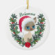 C'est un joli ornement de Noël à donner à une petite-fille ou une fille. Le devant est orné d'un adorable chaton siamois aux grands yeux bleus et portant un chapeau de Père Noël rouge et blanc. Le chaton est encadré d'une couronne verte de fruits rouges et d'un arc rouge vif au fond. Le nom de votre enfant est en vert correspondant au sommet. Le dos de l'ornement a stylisé du texte à rayures rouges, vertes et blanches qui dit "Joyeux Noël", et deux champs de texte pour votre propre message. Au fond se trouve une gerbe de baies saintes et rouges.