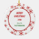 Sur le devant de cet ornement de vacances est un mignon chiot sibérien Husky gris portant une cravate casquette et arc. A côté de lui, il y a un cadeau de Noël rayé bleu. Les images sont placées sur un ovale blanc encadré par un motif de flocon rouge rétro. Le dos de l'ornement a le même arrière - plan et ovale avec votre texte personnalisé dans deux champs. Mignonne ! *Merci à Gift Season Shop pour l'image de chien dans ce design.