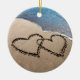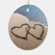 Belle photo originale de deux coeurs écrits dans le sable le long de l'eau bleue de l'océan pour signifier amour et romantisme. Grand concept pour l'amour, les voyages et les mariages d'été à venir. Un Noël de gardien amusant et unique, la Saint-Valentin, ou autre jour férié, ornement à donner à cette personne spéciale, mariée et mariée ou tout couple amoureux.