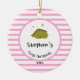 Élégant, moderne et mignon ornement de Noël photo bébé sur motif rose rayé. Ce modèle présente une adorable illustration de dinosaure bébé vert dormant sous les étoiles jaunes dorées avec le nom de bébé personnalisé. Reverse pour révéler une belle photo bébé dans le cadre rouge stripe cercle. Idéal pour le bébé garçon et la fille. Un cadeau parfait pour toutes les saisons !