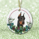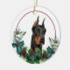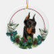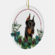 A l'avant de cet ornement de vacances se trouve un beau portrait d'un Doberman Pinscher Dog noir et bronzé, regardant d'un bourbier saint et à feuillage persistant. Les baies rouges et les cônes de pin ornent les sprigs de houx et de pin. L'image est placée sur un cercle blanc à l'intérieur d'un cercle mince de ligne rouge. L'arrière de l'ornement a la même couronne à feuillage persistant et rond avec votre texte personnalisé en rouge.