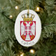 Célébrez l'héritage serbe avec cet élégant ornement en céramique représentant le drapeau national de la Serbie. Le design met en valeur le classique tricolore horizontal rouge, bleu et blanc, orné des armoiries mineures décalées vers le côté de la hampe. L'héraldique comprend l'aigle blanc bicéphale iconique sur un bouclier rouge, surmonté d'une majestueuse couronne royale, représentant la longue et riche histoire souveraine de la nation.