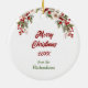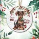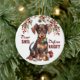 Sur le devant de cet ornement de Fêtes est l'image d'un mignon chiot Doberman Pinscher portant un collier saint et rouge aux baies. Il est assis avec un ornement d'arbre cassé devant lui, et d'autres à côté de lui. Le texte en rouge dit "Cher PÈRE NOËL, définissez-vous NAUGHTY". Au verso, le texte rouge et vert indique MERRY CHRISTMAS", et il y a des champs de texte supplémentaires pour vous permettre de customiser à ce que vous voulez.