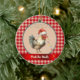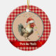 Cet amusant ornement de Noël "Peck the Halls" ajoute un petit humour de ferme à votre décor de vacances ou à votre sapin de Noël. Ce charmant poulet au chapeau de Père Noël ajoute un peu de fantaisie de la ferme avec une touche de plaisir de la volaille de vacances. Une série de lumières est suspendue au-dessus de la tête du coq, avec une série partielle de lumières suspendues à son bec. Le coq se trouve sur un motif de Suisse à pointes blanches et imbriquées, entouré d'une en vichy plaid de style campagnard. Vous pouvez modifier le texte humoristique sous le coq, qui apparaît dans la crème à travers un ruban, comme ajouter votre nom ou année.