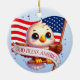 Cute Baby Bald Eagle with GOD BLESS AMERICA banner, holding an iconic patriotic USA red, white & Blue flag with stars & stripes. Bird Wildlife Animal Ceramic Xmas Holiday Season Patriotism Decor Ornament. Christmas tree hanging decoration gift for patriot. 🦅🇺🇸