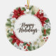 Beautiful watercolor-style holiday design featuring a wreath of red poinsettias, white flowers, pine needles, and silver berries surrounding the script text "Happy Holidays."