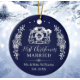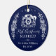 Celebrate your first holiday season as newlyweds with this elegant navy blue ceramic ornament with white text, featuring a classic just-married car illustration and floral accents. Personalize it with your "Mr. & Mrs." last name and established year to create a timeless keepsake for your tree. Makes a beautiful gift for couples celebrating their first Christmas together.