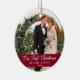 Élégant script de calligraphie Notre première photo de Noël Ornement Bourgogne avec des flocons de neige - Parfait pour une photo Mariage ou une photo en couple