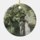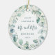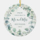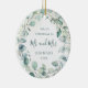 Élégant ornement en céramique avec une couronne composée de feuilles d'eucalyptus et de verdure avec un soupçon de bleu avec "Notre premier Noël en tant que Monsieur et Madame" avec votre nom de famille et votre année en vert foncé sur un lave pastel aquarelle. L'arrière a votre photo mariage préférée. Cet ornement botanique rustique fait aussi un grand cadeau pour un couple marié pour son premier Noël.