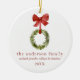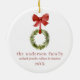 Un ornement personnalisé de noël de famille garde saké de noël arboré. Cet ornement en céramique est orné d'une couronne rustique de boiseries de Noël suspendue à un arc rouge. Personnalisez avec votre nom de famille, nom de famille, année ou personnaliser avec le libellé de votre choix.