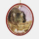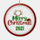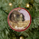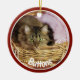 Photo de l'animal de compagnie ornement de Noël fait dans une forme ronde céramique, avec graphismes rouge encadré photo personnalisée, sur le devant avec texte blanc. Le dos est fait en rouge, vert et blanc avec texte graphique lisant Joyeux Noël et une année personnalisée votre personnalisation. Ajoutez la photo de votre animal de compagnie, son nom et l'année pour un grand ornement de vacances pour se souvenir de votre animal de compagnie.