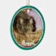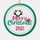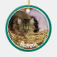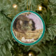 Photo d'animal de compagnie ornement de Noël fait dans une forme ronde céramique, avec des graphiques d'une photo turquoise encadrée personnalisée, sur le devant avec du texte blanc. Le dos est fait en rose et blanc saumon turquoise avec un texte graphique lisant Joyeux Noël et une année personnalisée pour vous de personnaliser. Ajoutez la photo de votre animal de compagnie, son nom et l'année pour un grand ornement de vacances pour se souvenir de votre animal de compagnie.